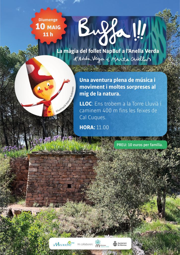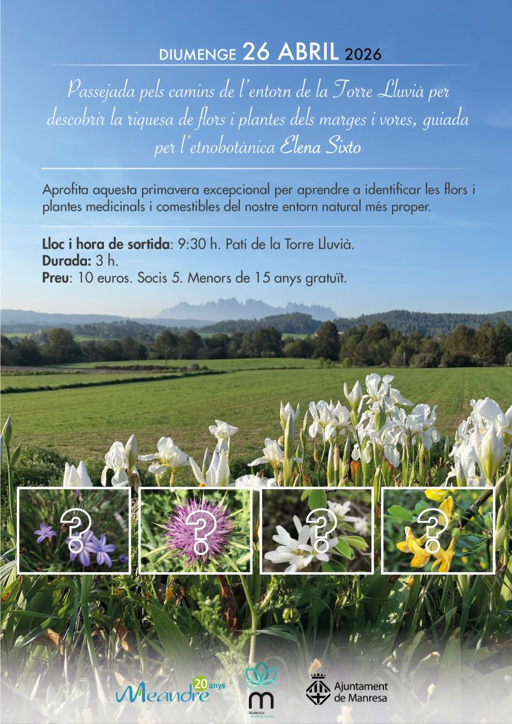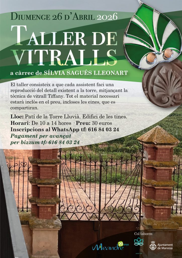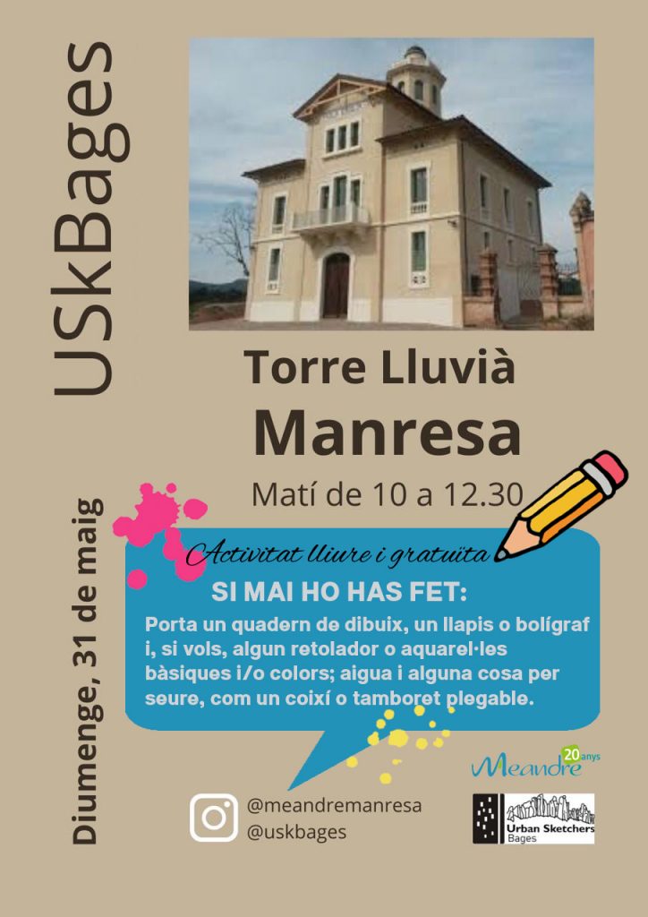 Caminades pel Verd Urbà (mireu calendari mensual) / Taller d’aquarel·la 11, 18 i 25 d’abril / amb Oriol Olivé (Places exhaurides) / diumenge 26 d’abril / Taller de Vitralls amb Sílvia Sagués / diumenge 26 d’abril / Passejada i reconeixement de plantes i flors amb Elena Sixto / diumenge 10 de maig/ Espectacle Infantil Buffa!! / Urban Sketch diumenge 31 de maig / Jornada d’Urban Sketch amb USK del Bages